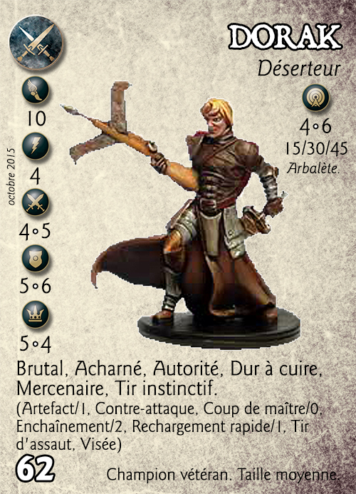 Compétences : Brutal, Acharné, Autorité, Dur à cuire, Mercenaire, Tir instinctif. (Artefact/1, Contre-attaque, Coup de maître/0, Enchaînement/2, Rechargement rapide/1, Tir d'assaut, Visée).