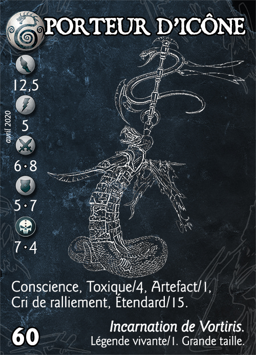 Incarnation de Vortiris. Lors de son activation, le porteur d’icône peut désigner un combattant Ophidien ami de grande taille dans son aura de commandement. Ce dernier gagne les compétences « Abominable » et « Furie guerrière » jusqu'à la fin du tour.
