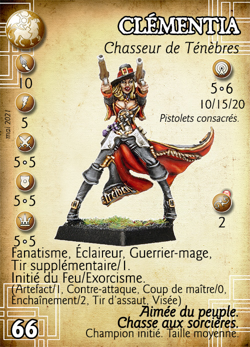 | Capacités : Aimée du peuple. Chaque fois qu'elle subit un jet de Blessures, Clémentia peut dépenser 1 gemme de Feu, le jet de Blessure est alors effectué sur un combattant ami du Griffon situé à 10cm ou moins. Chasse aux sorcières.