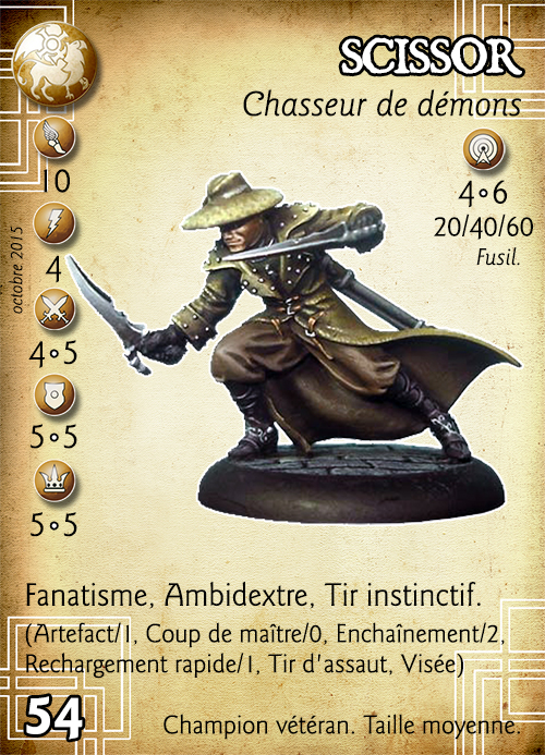 Compétences : Fanatisme, Ambidextre, Tir instinctif. (Artefact/1, Coup de maître/0, Enchaînement/2, Rechargement rapide/1, Tir d'assaut, Visée)