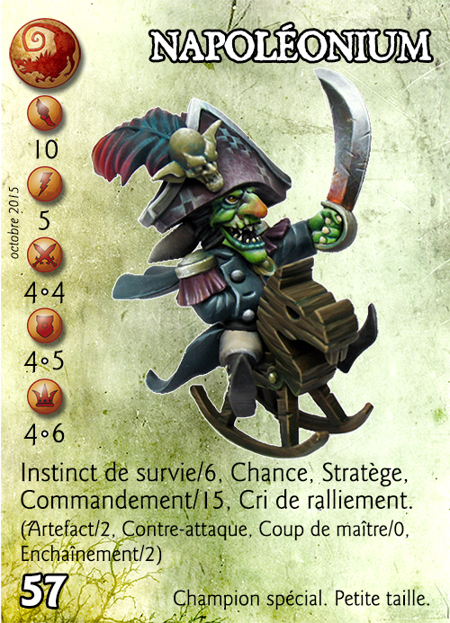 Compétences : Instinct de survie/6, Chance, Commandement/15, Cri de ralliement, Stratège. (Artefact/2, Contre-attaque, Coup de maître/0, Enchaînement/2).
