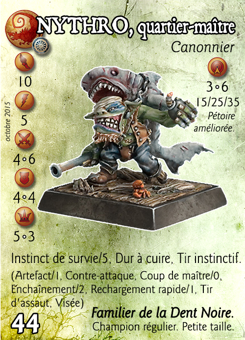 | Compétences : Instinct de survie/5, Dur à cuire, Tir instinctif. (Artefact/1, Contre-attaque, Coup de maître/0, Enchaînement/2, Rechargement rapide/1, Tir d'assaut, Visée) |