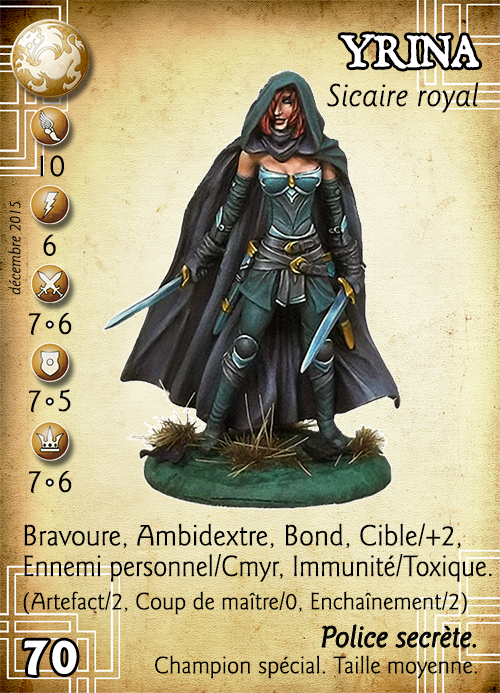 Un autre événement transforma la réputation d’Yrina en légende. Lorsqu'elle obtint son grade d'officier, elle paya un forgeron pour obtenir deux solides dagues à partir du métal de la lame de l'épée de son père ; elle avait récupéré cette dernière auprès de Toras des années plus tôt. Dans l'opération, la lame perdit son caractère sacrée mais l'intérêt était sentimental pour la jeune femme.